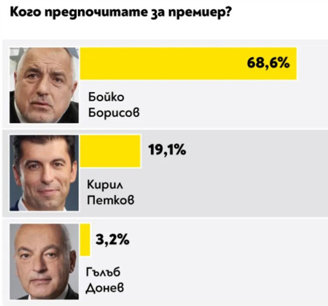 От допитването ясно проличава, че най-предпочитания министър председател е Борисов, който води с 68,6% пред втория Кирил Петков с 19,1%, а на трето място се подрежда Гълъб Донев.