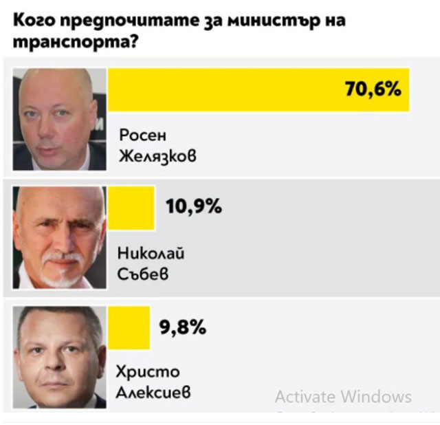 Най-желан министър на земеделието е Десислава Атанасова. Най-много гласове в анкетата за министър на околната среда и водите е събрал Емил Димитров-Ревизоро с над 56%.