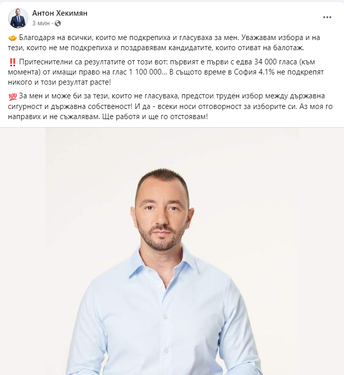 " Благодаря на всички, които ме поддържаха и гласоподаваха за мен. Уважавам избора и на тези, които не ме поддържаха и приветствам претендентите, които отиват на балотаж ", съобщи Хекимян на формалния си профил във фейсбук.