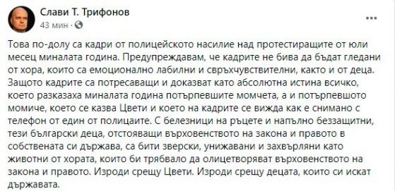 Лидерът на " ИТН " Слави Трифонов излезе с ядосан пост във фейсбук против полицейското принуждение при митингите против държавното управление на ГЕРБ през лятото на предходната година.
