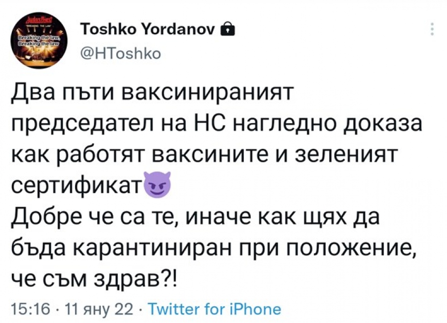 Лидерът на парламентарната група на " ИТН " Тошко Йорданов написа провокативен пост в обществените мрежи, където намерено се подигра на имунизацията против ковид. По-рано през днешния ден той, дружно с всички първи мъже в страната, бе подложен под карантина след съвещанието на Консултативния съвета за национална сигурност (КСНС) при президента, който се организира в понеделник (10 януари). Малко след него стана ясно, че ръководителят на Народното събрание Никола Минчев е дал позитивна проба за COVID-19. Именно за него Йорданов написа: