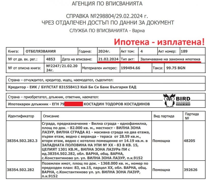 Според информацията, теренът се намира на първа линия над морето – аграрен парцел с идентификатор 73780.501.950 с повърхност от 500 кв.м. Той е закупен от Костадинов през 2023 година на цена от 78 800 лева, платени напълно без ипотечен заем, оповестява BIRD.