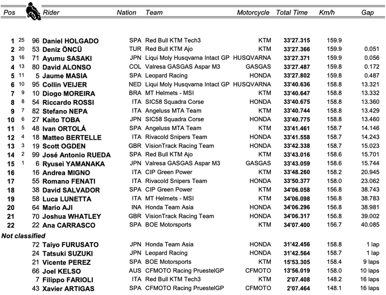 Испанецът стигна до успеха на „ Муджело “ след изпреварване безусловно в последните метри на конкуренцията. Той се възползва от резултата на въздушното евакуиране в дългия спринт от последния завой до финалната линия и съумя да изпревари Дениз Ончу, който и през днешния ден не съумя да се пребори за своята първа победа в Moto3.