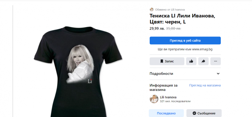 Лили Иванова, откри собствен интернет магазин, където продава артикули със своите букви. Естрадната прима продава брандирани с нейните букви артикули, които предлага онлайн. Близо 100 лева коства дребна гривна в уеб страницата на примата на естрадата, а за 25 лева се продава черна тениска с нейната физиономия. Не липсват искащи, които да си закупят стоките, научи Lupa.bg.