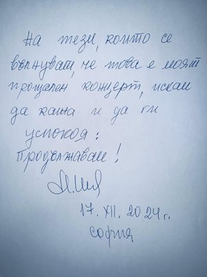 " На тези, които се вълнуват, че това е моят сетен концерт, желая да кажа и да ги успокоя: ПРОДЪЛЖАВАМ! ", написа в формалния си фейсбук профил именитата певица.