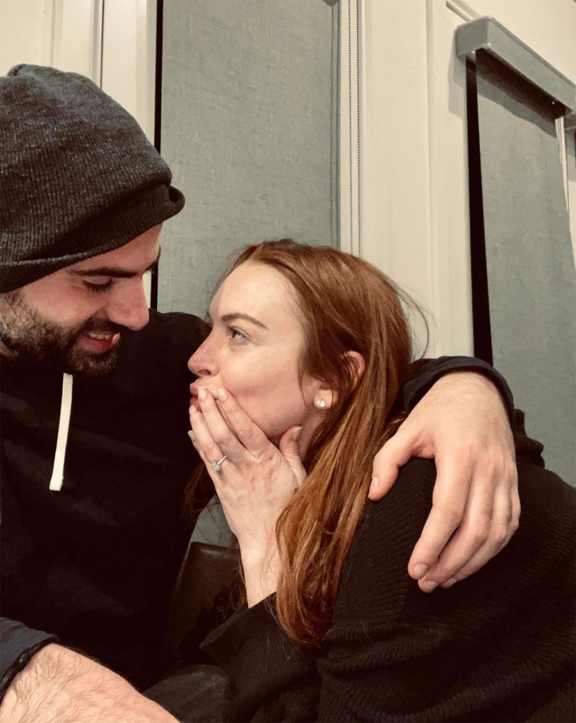 Линдзи Лоън разкри, че се е сгодила за Бадер Шамаз. Феновете видяха за първи път солидния камък " бенгал " на Хари Уинстън в поредност от фотоси, споделени от актрисата.