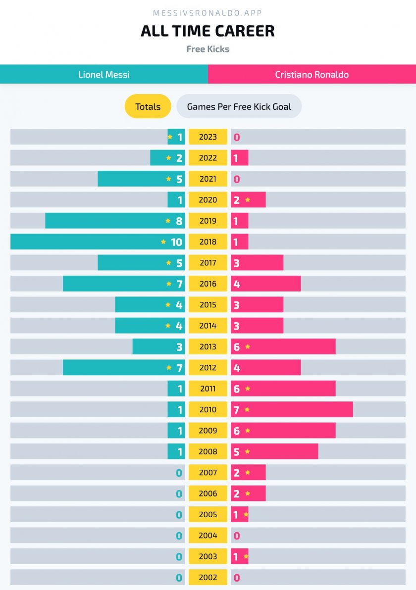 Меси към този момент има 61 гола от свободни удари, като най-вече попадение записа през 2018 година - 10.
