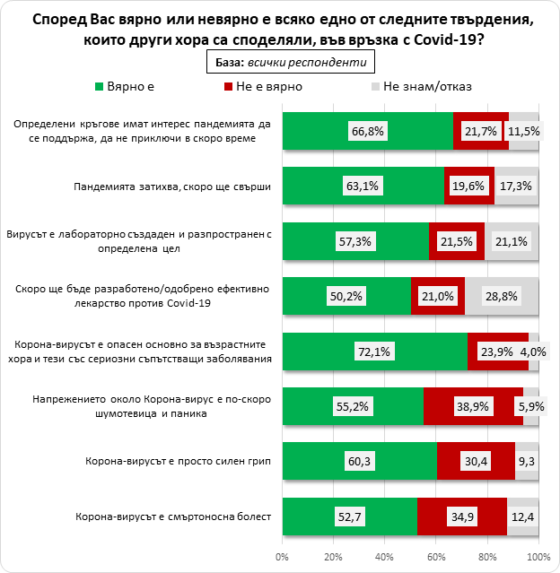 Над две трети от всички запитани са съгласни с изказванието, че избрани кръгове имат интерес пандемията да се поддържа, да не завърши скоро (66,8%). Повече от половината от участвалите в проучването пък са на мнение, че вирусът е лабораторно основан (57,3%) и че напрежението към Covid е по-скоро шумотевица и суматоха (55,2%). За 60% Covid е просто мощен грип.