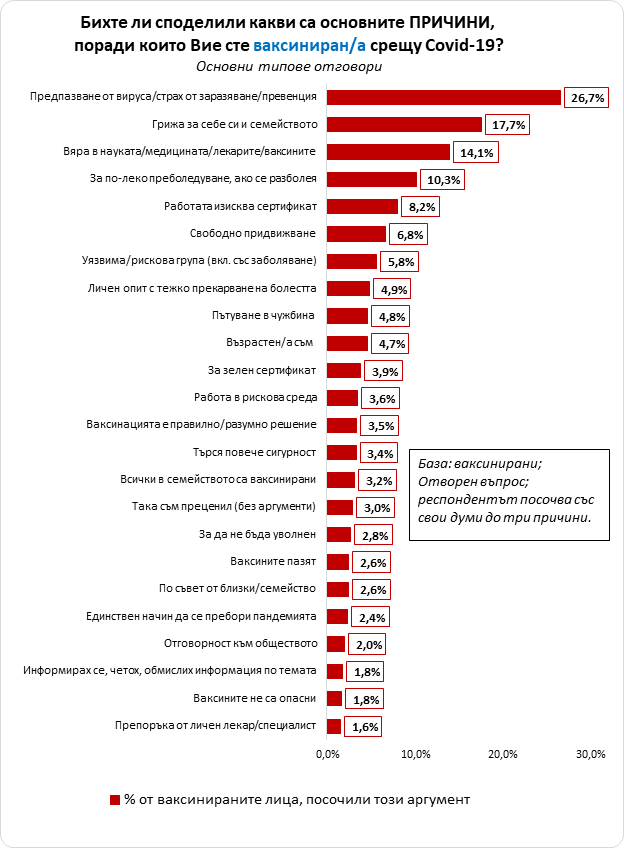 Страхът от вируса и желанието на хората да се предпазят са съществена причина за ваксинациа съгласно 26,7% от интервюираните. Грижата за фамилията и близките - за 17,7%, вярата в науката и медицината - за 14,1%.