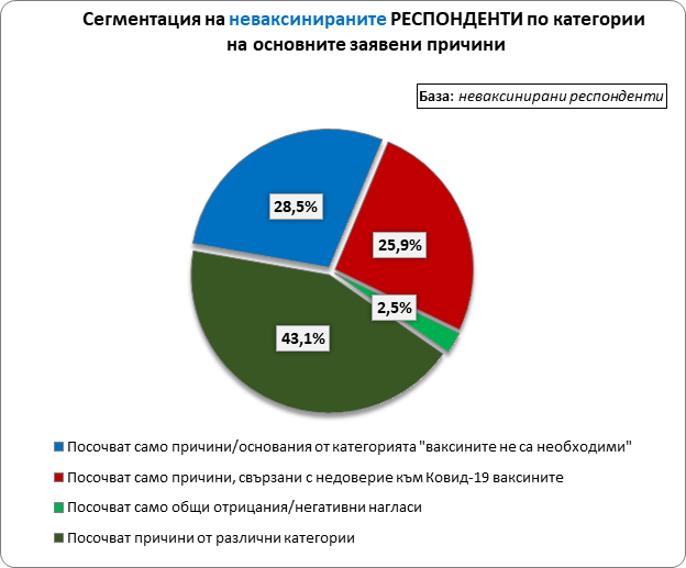 В отговор на въпроса „ Какви са главните аргументи, заради които Вие сте неимунизиран против Covid-19? ” една пета (21,2%) от неимунизираните у нас показват като причина за отвод от имунизация към този миг преболедуване на вируса. В 6,7% от интервюираните проличава разбиране, че респондентът има задоволително антитела или задоволително мощен имунитет. За почти една пета (19,1%) от хората, имунизацията в действителност би навредила заради съществуване на съпътстващи болести, алергии или други аргументи.