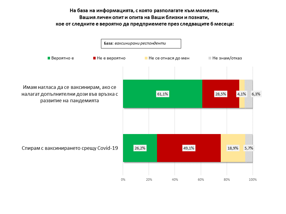 Изследването още един път демонстрира, че склонни към продължаваща имунизация са най-много самите имунизирани. Ваксинацията при останалите ще е в сериозна степен предизвикателство. 61,1% от всички имунизирани имат настройката да си слагат още ваксини (дори след бустерната), в случай че се наложи. Делът на имунизираните, които декларират, че не биха се ваксинирали повече против ковид-19 е 26,2%.