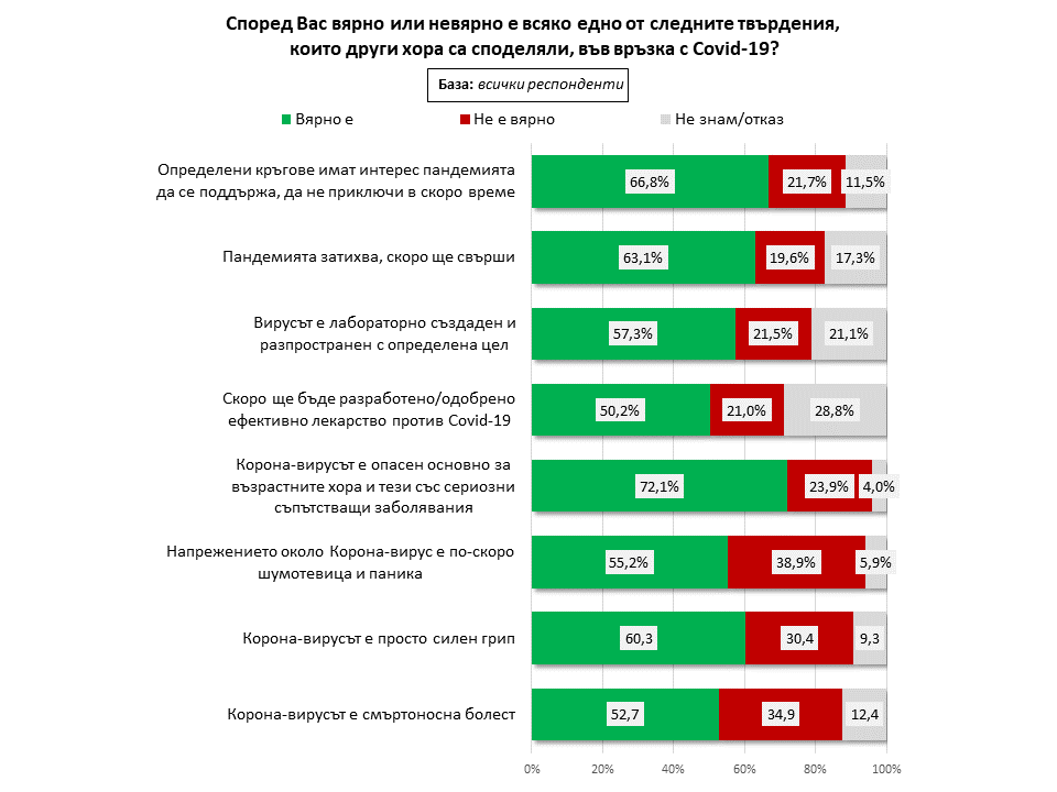 В същото време необятно болшинство в страната се съгласява, че коронавирусът е рисков най-много за възрастните и хора и тези със болести (72,1%). 63,1% показват мнението (и надеждата), че пандемията затихва и скоро ще завърши.