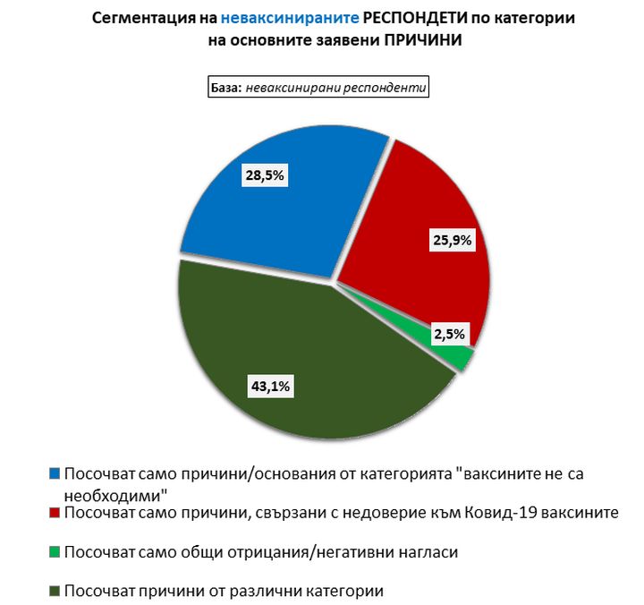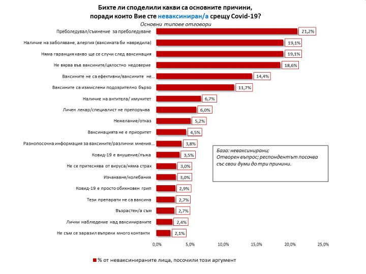 В отговор на въпроса „ Какви са главните аргументи, заради които Вие сте неимунизиран против COVID-19?” една пета (21,2%) от неимунизираните у нас показват като причина за отвод от имунизация към този миг преболедуване на вируса. Към тях могат да се прибавят и отговорите на 6,7% от интервюираните, в които проличава разбиране (или знание), че съответният респондент има задоволително антитела или задоволително мощен имунитет. За почти една пета (19,1%) от хората, имунизацията в действителност би навредила заради съществуване на съпътстващи болести, алергии или други аргументи.