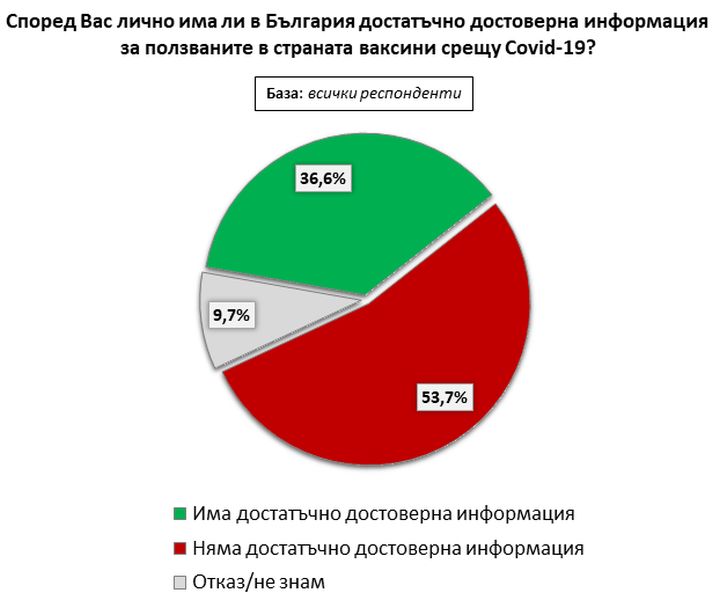 Липсата на задоволително надеждна информация е назовавана в експлицитен въпрос като проблем, въпреки в отговорите да проличава и прочут инерционен песимизъм. За повече от половината от всички запитани (53,7%) достоверната информация за употребяваните в страната ни ваксини против COVID-19 не е задоволителна. Малко над една трета (36,6%) считат, че надеждната информация за имунизациите у нас е задоволително, а към една десета не могат да преценяват. Сред неимунизираните респонденти проличава и по-висок дял на отговорите, че достоверната информация за имунизациите не е задоволително.