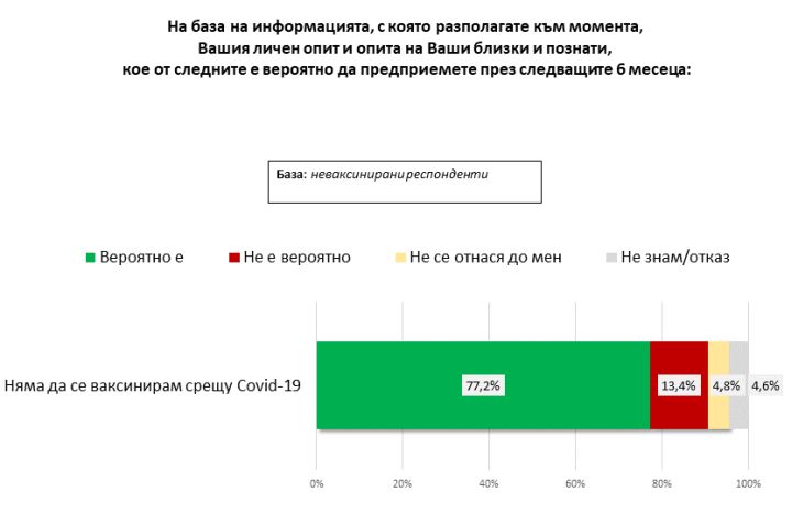 Сред неимунизираните респонденти делът на тези, които декларират, че няма да си слагат ваксина, е над три четвърти (77,7%). Около една десета се движат дяловете на неимунизирани, които биха траяли в съответните стадии (с първа доза, цялостен курс и пр.)