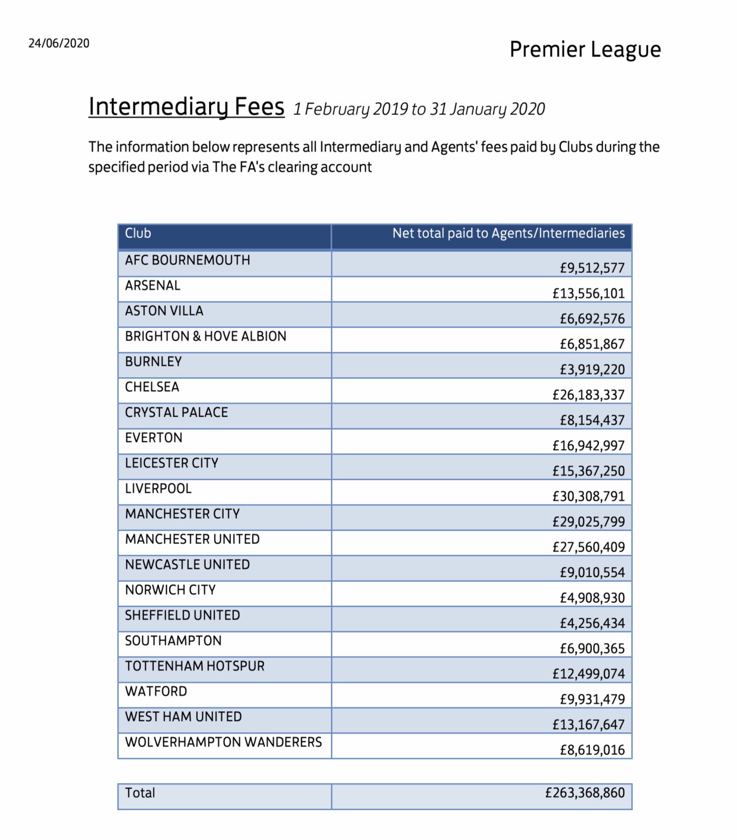 Общо всички клубове от Висшата лига са изплатили на футболните сътрудници 263 милиона паунда.