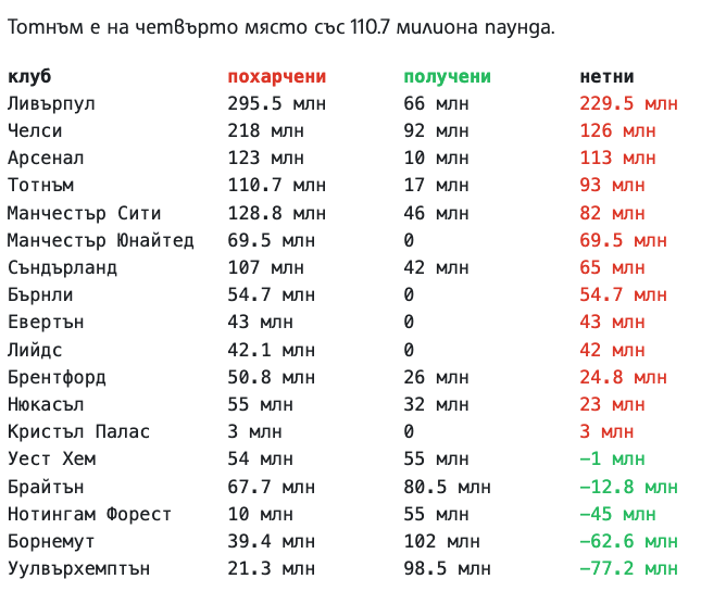 След като Екитике подпише контракта си, който ще бъде за шест години, Ливърпул ще доближи 295.5 милиона паунда за изходящи прехвърляния през лятото. Това е със 75 милиона повече от Челси и повече от Арсенал и Манчестър Сити дружно. Тези два клуба са трети и пети в класацията. Тотнъм е на четвърто място със 110.7 милиона паунда.