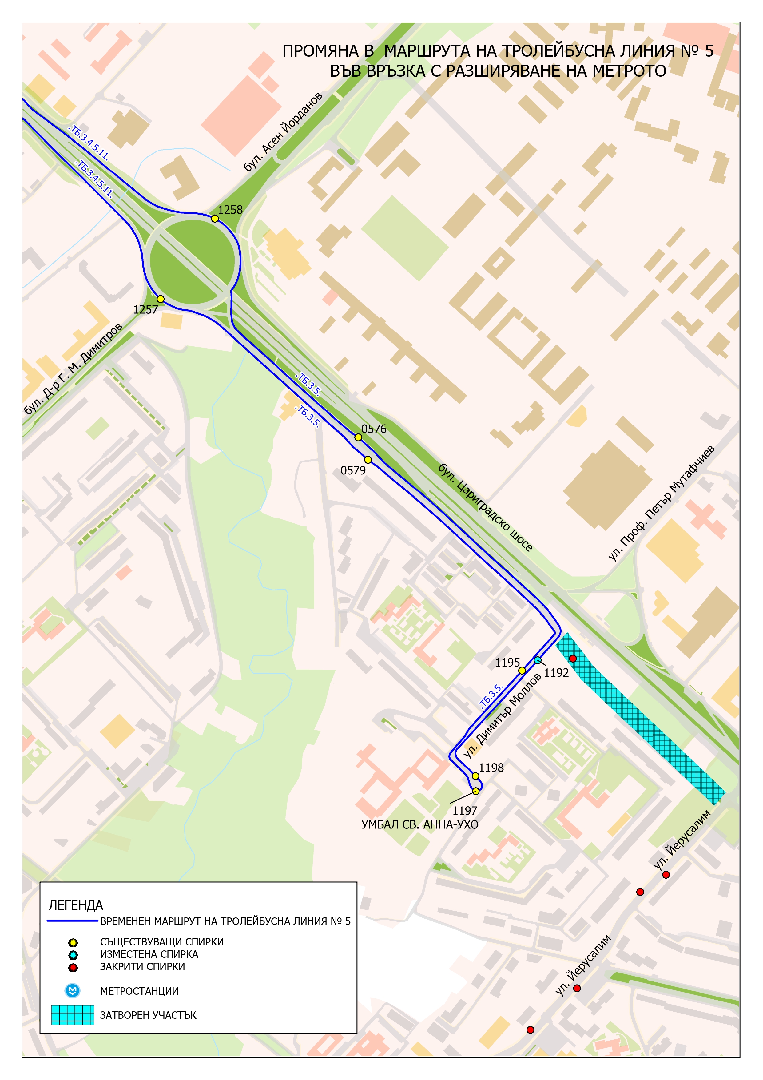 Маршрутът на тролейбусна линия № 5 се съкратява до УМБАЛ „ Св. Анна “. Тролеите ще се движат от надлез „ Надежда “ по настоящия маршрут до кръстовището на локалното пътно платно на бул. „ Цариградско шосе “ с ул. „ Димитър Моллов “ и надясно по ул. „ Димитър Моллов “ до крайната станция на тролейбусна линия № 3 в двете посоки.