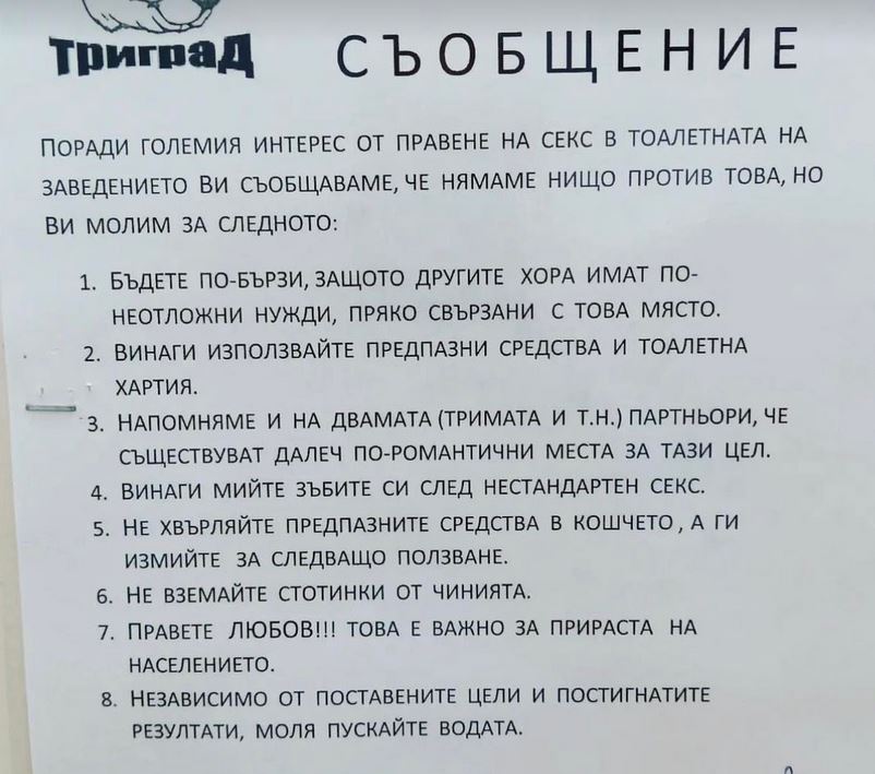 " Поради огромния интерес от правене на секс в тоалетната на заведението Ви оповестяваме, че нямаме нищо срещу това, само че молим следното ", четем в посланието. По- надолу откриваме и няколко иронични, мъдри, само че и злободневни молби към разпалените двойки (или тройки).