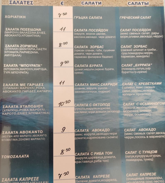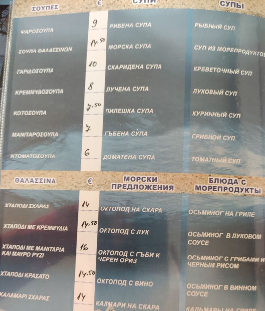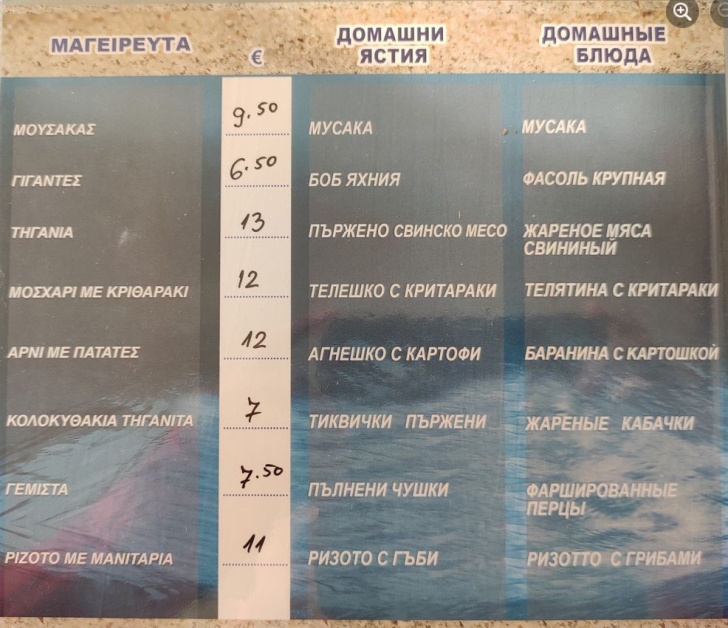 Прави усещане, че изборът за халване е огромна, а ястията са изписани на български, съветски и гръцки. Удоволствието да хапнете мусака излиза 9,5 евро, а яхния фасул - 6,5 евро. Порции с месо излизат 12-13 евро, а морските деликатели са на цени от варират от 14 до 16 евро.