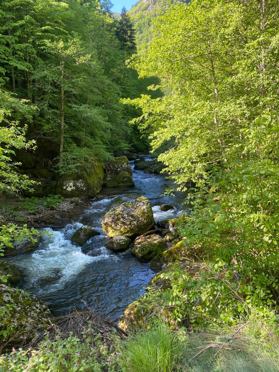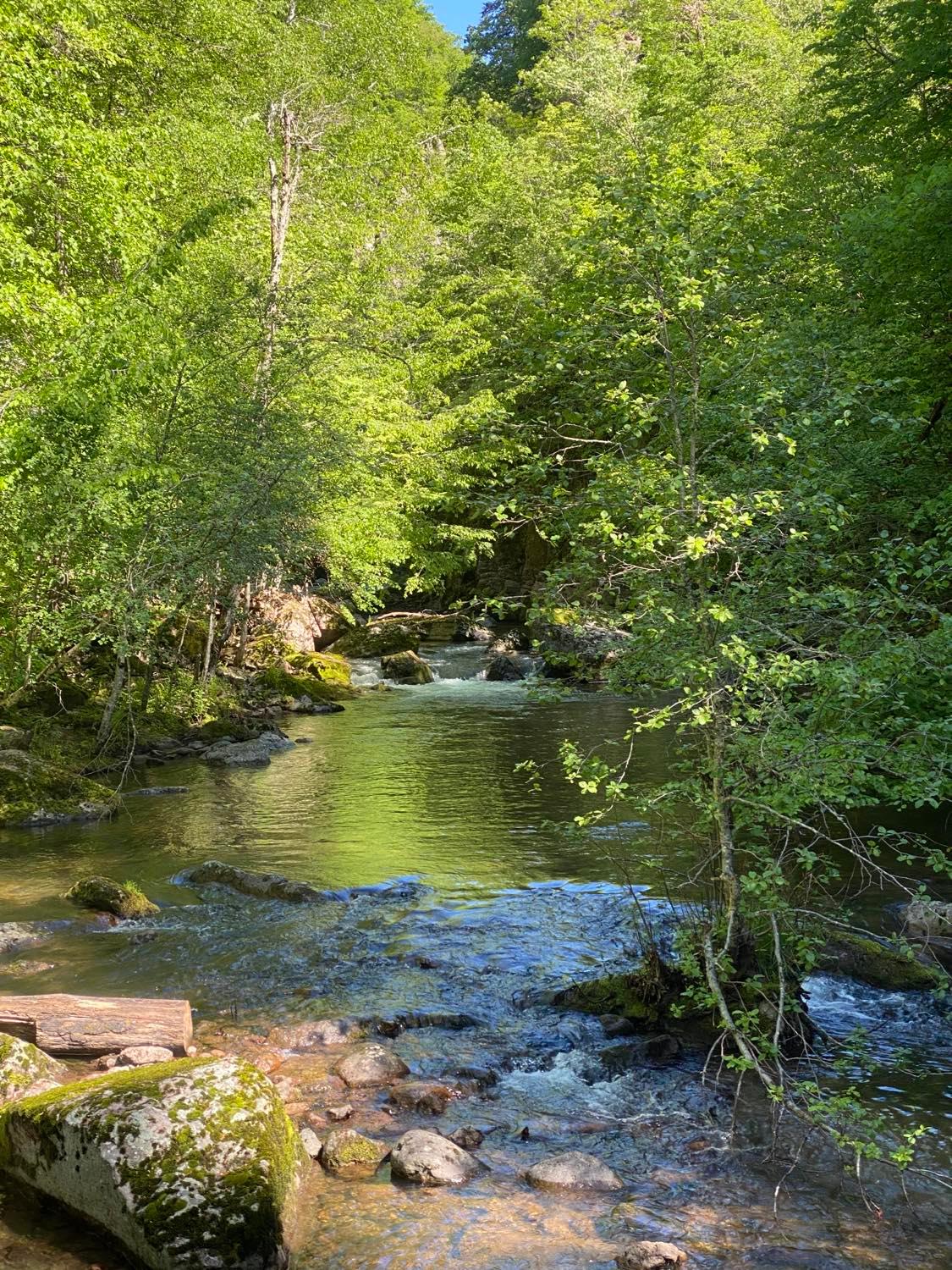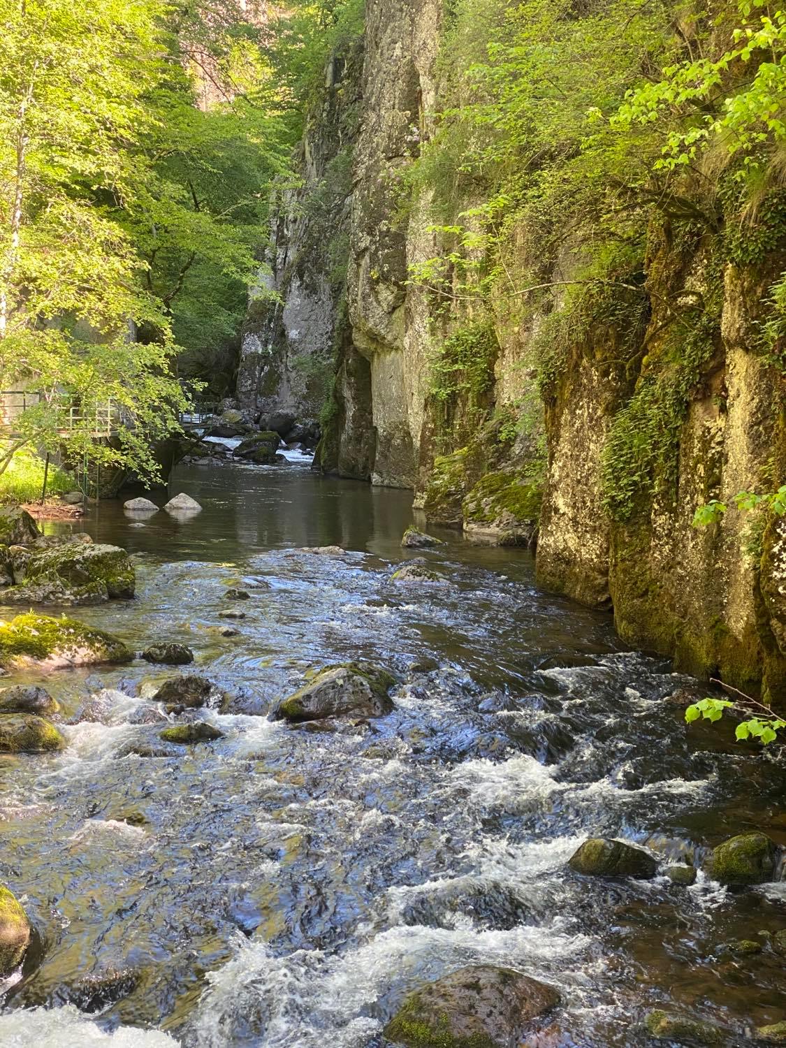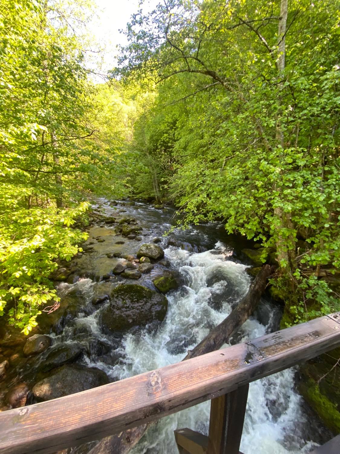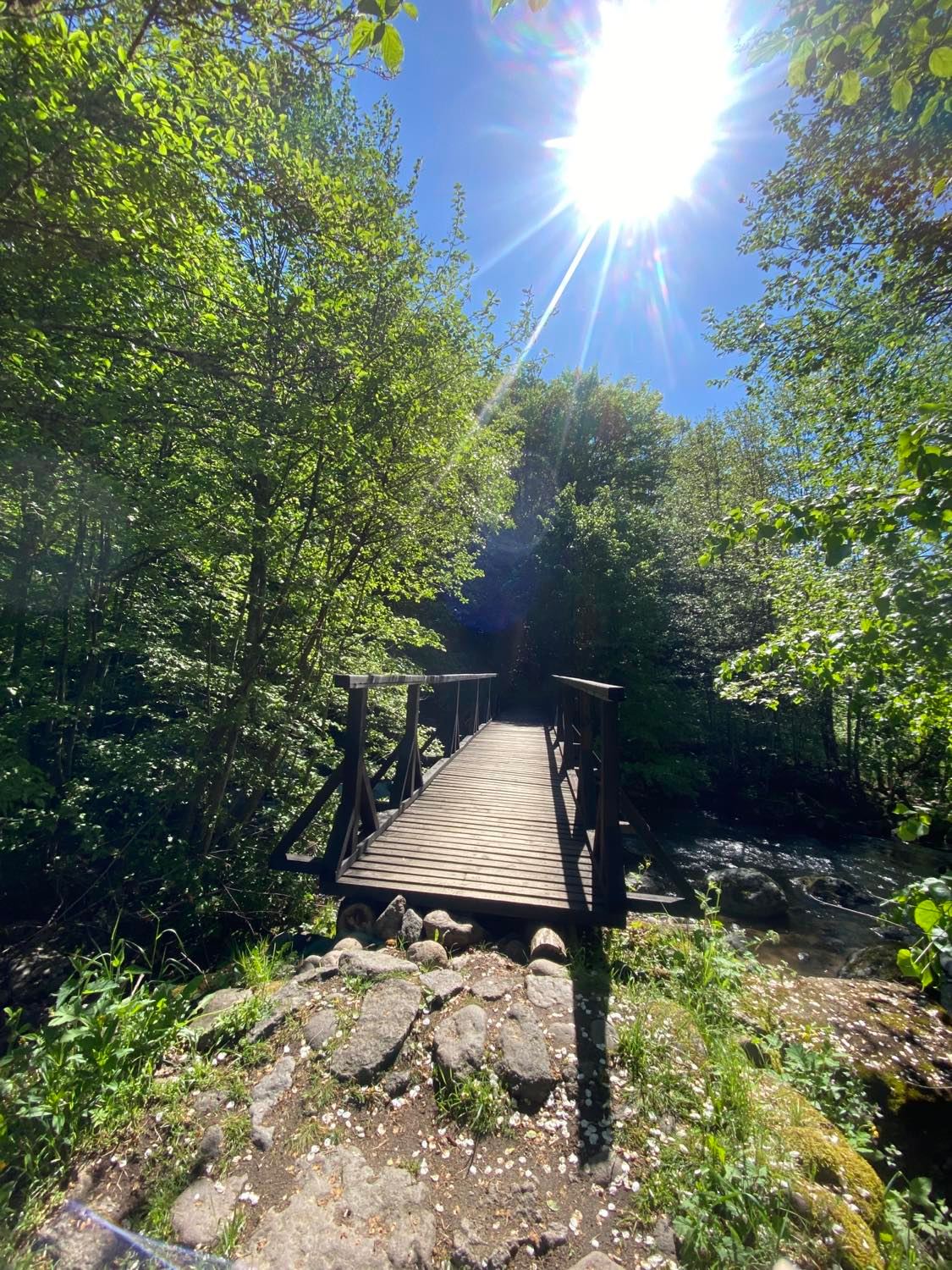 Екопътеката ни води до местността Лъката и до още един доста висок и хубав водопад – Мечешкия. Продължавайки по пътеката, стигаме до емблематичните зелени мостове над река Девинска. Пресичайки реката по моста местността Лъката.