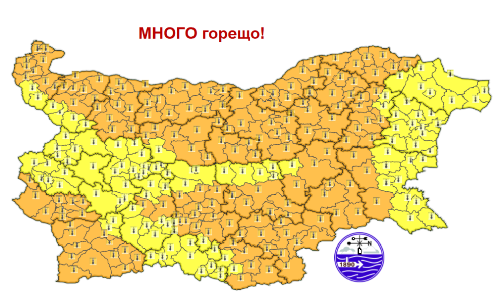 Оранжев код е разгласен съвсем в цялата страна без областите Добрич, Варна, София, Смолян и Перник, където е в действие жълт код за рискова горещина.