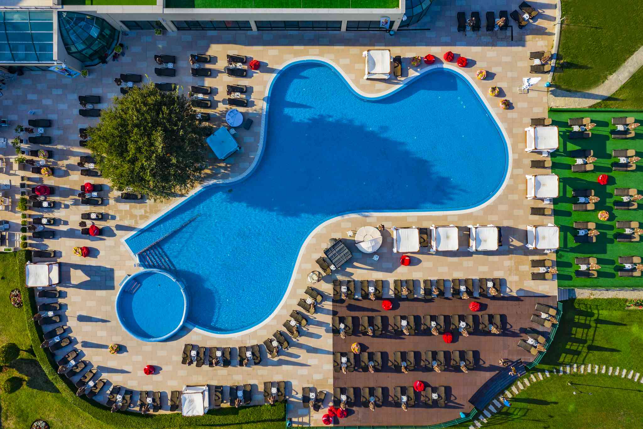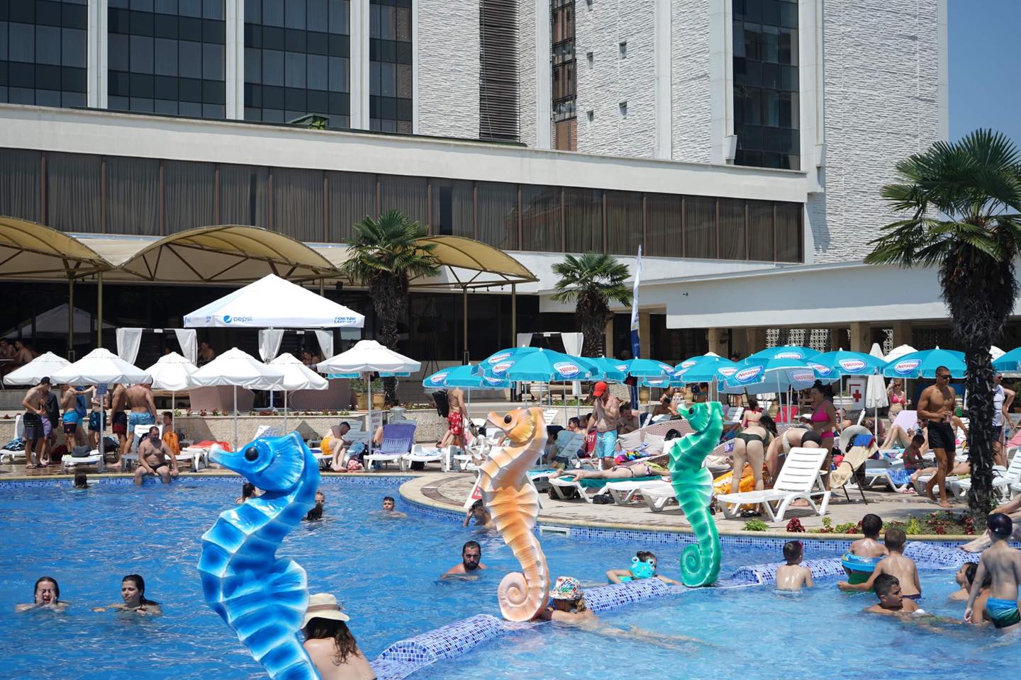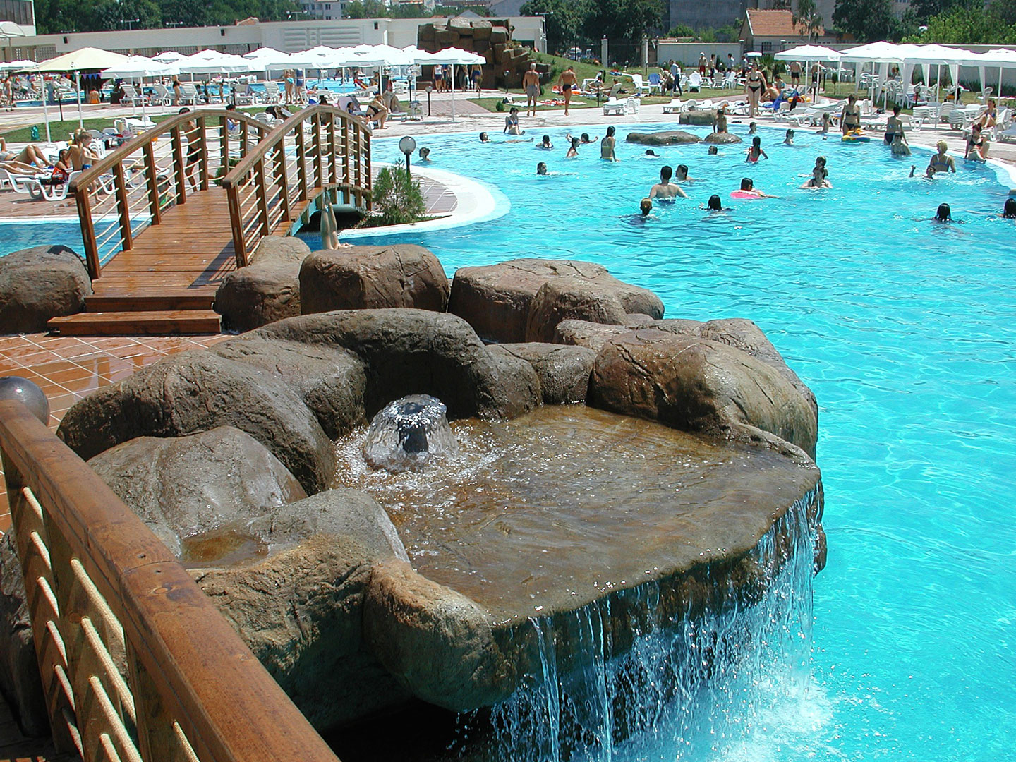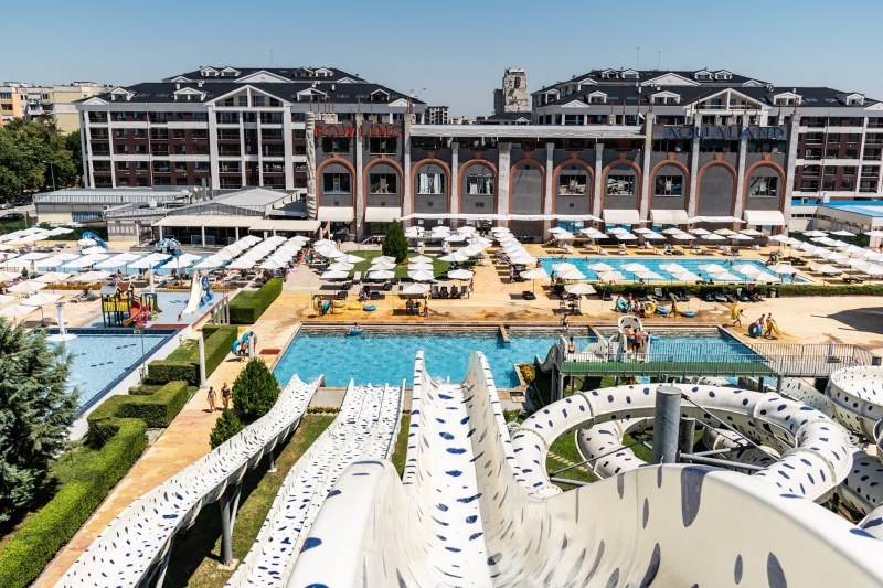 Koмплексът побира аквапарк с лятна градина, пет атрактивни плувни басейна в това число и дребен олимпийски, свързани с водни каскади и резултати, водопади, шадравани и скални пещери. Разполага с воден бар, четири открити коктейл бара, от които и бар направен като копие на остаряла испанска галера.