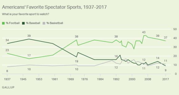 Въпреки множеството кавги към НФЛ 37% от американците показват локалната версия на футбола като собствен обичан спорт. Макар и понижен с 6% за последното десетилетие, ползата към играта остава повече от три пъти по-голям спрямо този към баскетбола (11%) и бейзбола (9%). Процентът на бейзбола е най-ниският в 81-годишната история на анкетата.