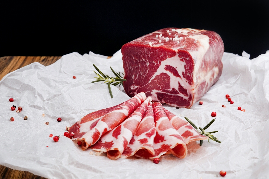 Нарежете приготвеното свинско месо на тънки филийки. Поставете в паница, залейте с разтопено масло и украсете с магданоз. Сервирайте с картофено пюре или пържени картофи. Гарнирайте с краставици, домати и чушки.
