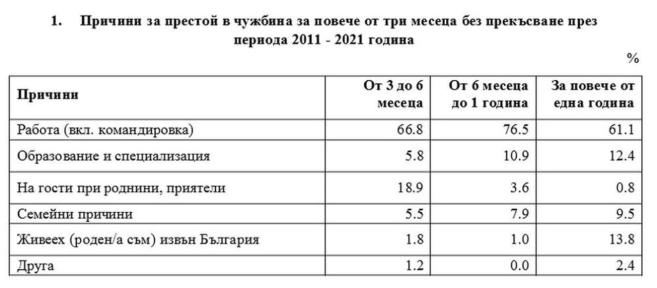 Данните от проучването демонстрират, че през последните 10 години (2011 – 2021 г.) за повече от три месеца без спиране в чужбина са обитавали 7.5% от лицата на възраст 15 - 74 години. От тях 37.0% са били отвън България за интервал от три до шест месеца, 18.1% - от шест месеца до една година, а 44.9% - за повече от една година. Основна причина за престоя им отвън страната без значение от периода на престояване е работата.