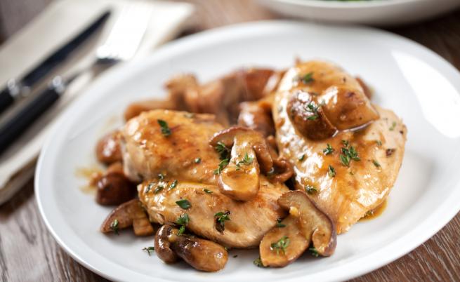 Обезкостете пилето и го нарежете на порции - вижте по какъв начин със видеото. Почистете и нарежете гъбите на шайби. Смесете сметаната с водата, топеното сирене и виното. В йенски съд подредете месото и гъбите залейте ги със смета и гответе за към 40 мин. Разбъркайте след 20 мин и настържете кашкавал.