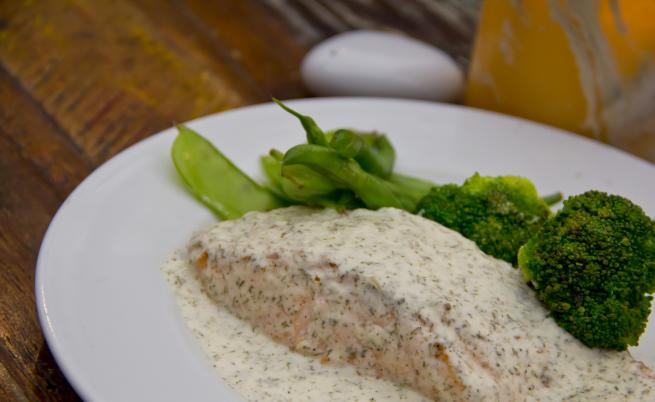 Нарежете 200 г броколи на дребни розички и ги сложете на дъното на скъклената тавички. Подредете рибата от горната страна и залейте със примес от масло и сметана. Овкусете и гответе към 20 мин.