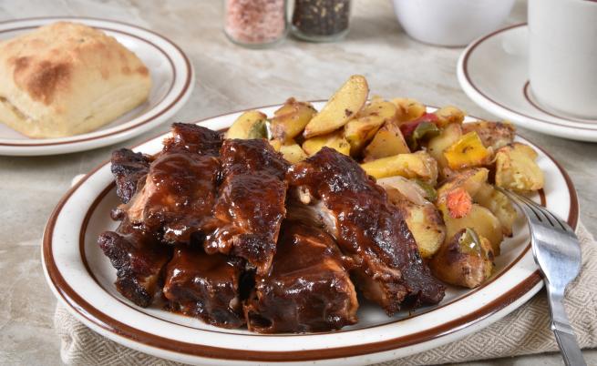 Измийте и нарежете картофите на полукръгчета. Подредете ги на дъното на йенския съд. Овкусете пържолите със сол и черен пипер и ги сложете върху картофите. Нарежете лукът на шайби и залейте с малко зехтин и вода. Печете до подготвеност и разбърквайте от време на време.