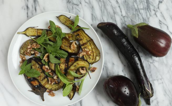 Патладжаните се белят и се режат натънко по дължина. Овкусяват се със сол и се оставят да излезе горчивата им вода. След това се измиват и подсушават. Намазват се със зехтин и се изпичат на грил тиган от двете страни.
