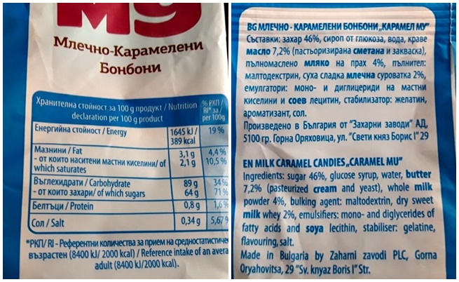 Нашите обичани бонбонки съдържат 46% захар, сироп от глюкоза, вода, 7,2% краве масло, 4% пълномаслено мляко на прахуляк и пълнител – малтодекстрин (полизахарид, който се употребява като хранителна добавка) и 2% суха сладка суроватка. Емулгаторите са моно- и диглицериди на мастни киселини и соев лецитин, а стабилизаторите – желатин, ароматизант и сол.
