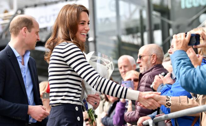 Херцогинята на Кеймбридж бе заложила на грациозен, само че изчистен тоалет от две елементи - блуза на райета и тъмносин панталон с висока талия. Всичко бе съчетано с обувки на не доста висок ток в същия цвят, както и дребна алена чанта.