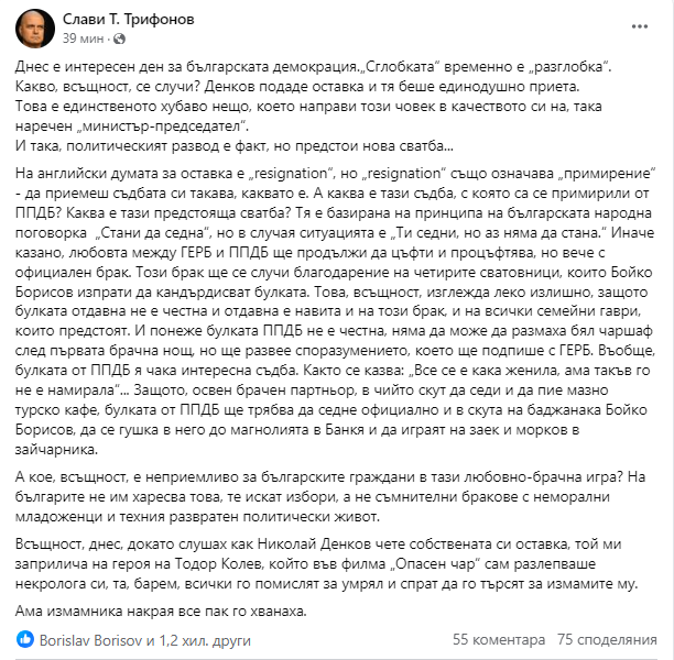 Така водачът на ИНТ Слави Трифонов разяснява оставката на премиера Николай Денков през днешния ден. Ето какво още сподели той на страницата си във фейсбук: