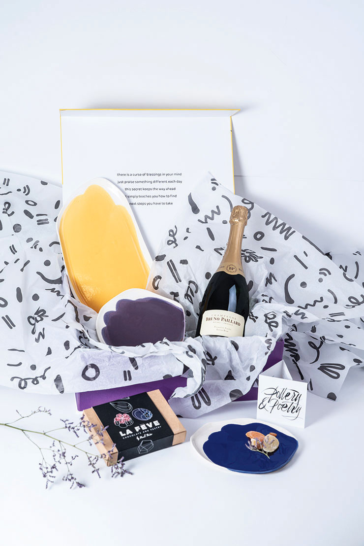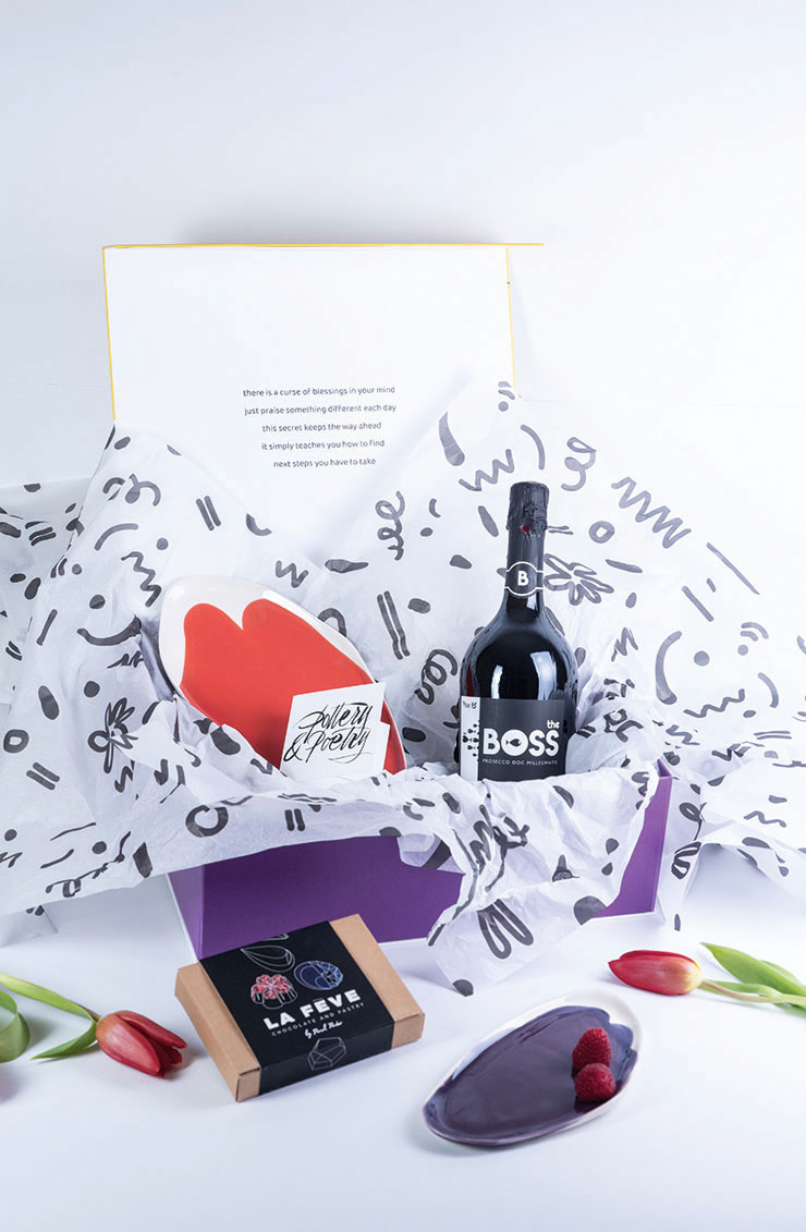 В елегантни gift boxes са съчетани с внимание особено подбрани виновност, ръчно направени шоколадови произведения La Feve на началник Павел Павлов (за ценителите на извънредни вкусове) и авторска керамика на Pottery & Poetry, бранд, спечелил към този момент интереса на колекционери оттатък рамките на страната ни.