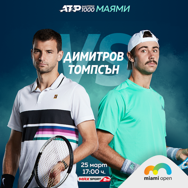 Мачът на Григор Димитров от III кръг на ATP Masters 1000 шампионата в Маями против австралиеца Джордан Томпсън ще се предава директно по MAX Sport 1 през днешния ден от 17,00 часа. Двубоят сред двамата ще открие програмата за деня на Корт 1 в тенис комплекса във Флорида.