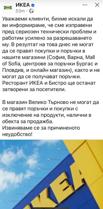 Магазините на ИКЕА в цялата страна през днешния ден не работят, сигнализираха разочаровани консуматори. По-късно и самата компания излезе със известие, че изпитва " механически проблеми ".
