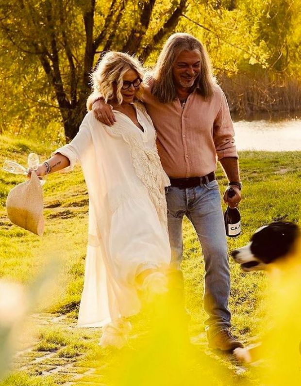 Двамата забегнаха измежду природата и се щракната с бутилка просеко. Както се вижда от фотографията в инстаграм, фамилията се разхожда наоколо до река или езеро. Компания на Маги и Кремена прави четириногият им любим.