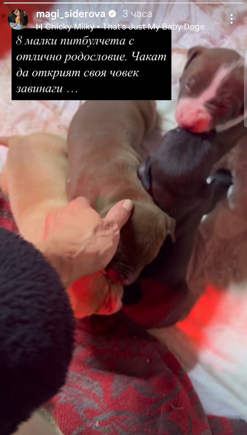 Маги Сидерова се похвали с 8 бебета питбули. Моделката отглежда майката и бащата на бебетата и е решила да има потомство от животните, което най-вероятно ще продаде. Общо брюнетката има в дома си 10 питбула - мъжки, женски и техните 8 бебета.