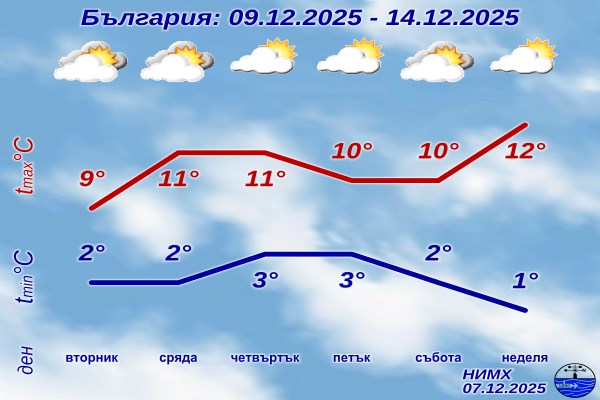 Максималните температури в понеделник ще варират сред 7° и 12°, което е относително меко за началото на декември.