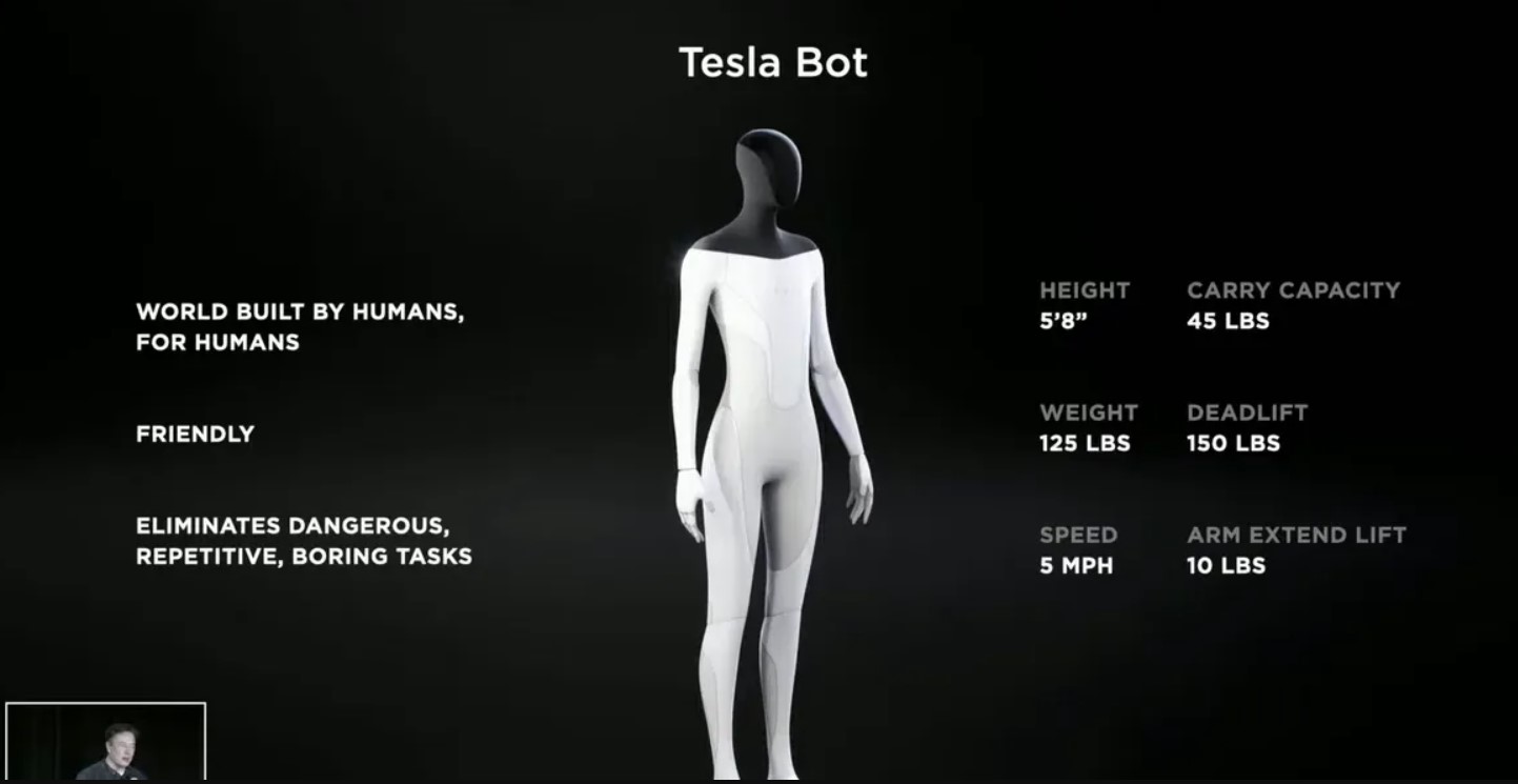 Роботът е модел на " Тесла ". Предстои да бъде показан на тридесети септември и се назовава Optimus.