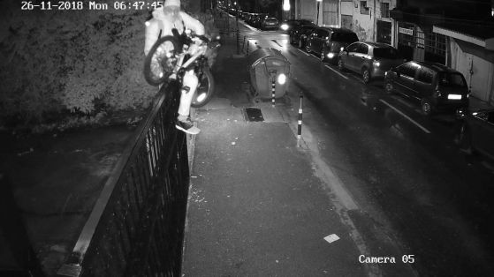 На фрагментите, снимани от охранителните камери, се вижда по какъв начин млад мъж оглежда двора, след което си поставя качулка и прескача високата ограда. Минута по-късно той излиза с детското колело и го подкарва в незнайна посока.