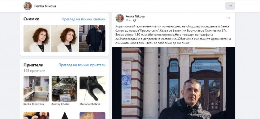 " Хора помагайте, племенникът ми изчезна през вчерашния ден на обяд, след посещаване в банка покрай пазара " Красно село ". Казва се Валентин Бориславов Станчев, на 37г. Висок към 1,80 м., едва телосложение. Не отговоаря на телефона си. Напоследък е в депресивно положение... Облечен е със същите облекла като на фотографията... апелирам, в случай че някой го забележи да ми написа " - зове Пенка Николова.