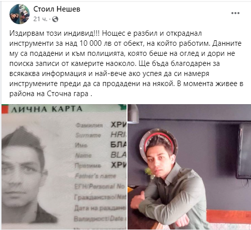" Издирвам този субект!!! Нощес е разрушил и откраднал принадлежности за над 10 000 лева от обект, на който работим. Данните му са подадени и към полицията, която беше на оглед и даже не изиска записи от камерите в близост. Ще бъда признателен за всякаква информация и най-много в случай че съумея да си намеря инструментите преди да са продадени на някой. В момента живее в региона на Сточна гара " - написа Стоил Нешев във фейсбук.