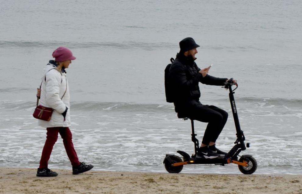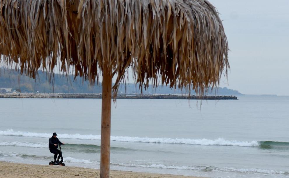 В сивия ноемврийски ден във Варна мъж реши да покара тротинетка край вълните на плажа .