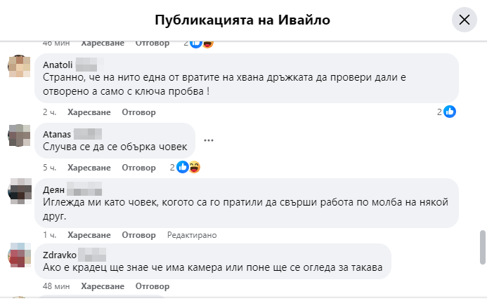 " Изглежда, че се е объркал. Има си ключове, явно не знае за къде и опитва коя врата ще се отключи. Ако не е от града и във входа ви се дава апартамент за нощувки през сезона - обикновено е ", написа Кристина П.