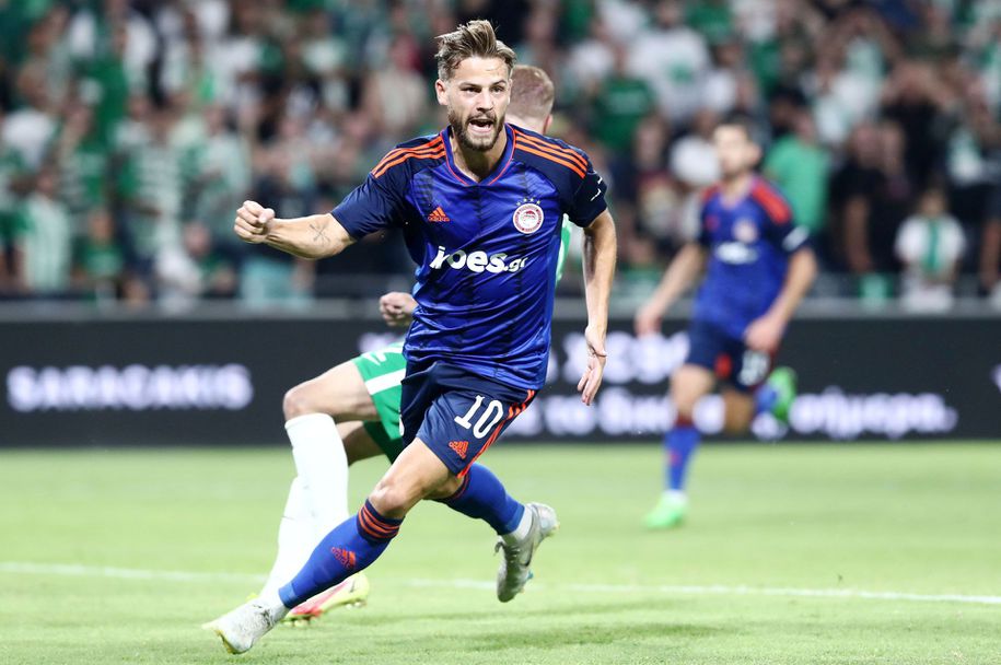 Мачът в стартира съвършено за гърците и те поведоха още в 7-ата минута с гол на едно от новите си попълнения -. Привлеченият от датчанин се оказа на точното място след удар в гредата на Тикиньо и от няколко метра безпроблемно откри резултата.